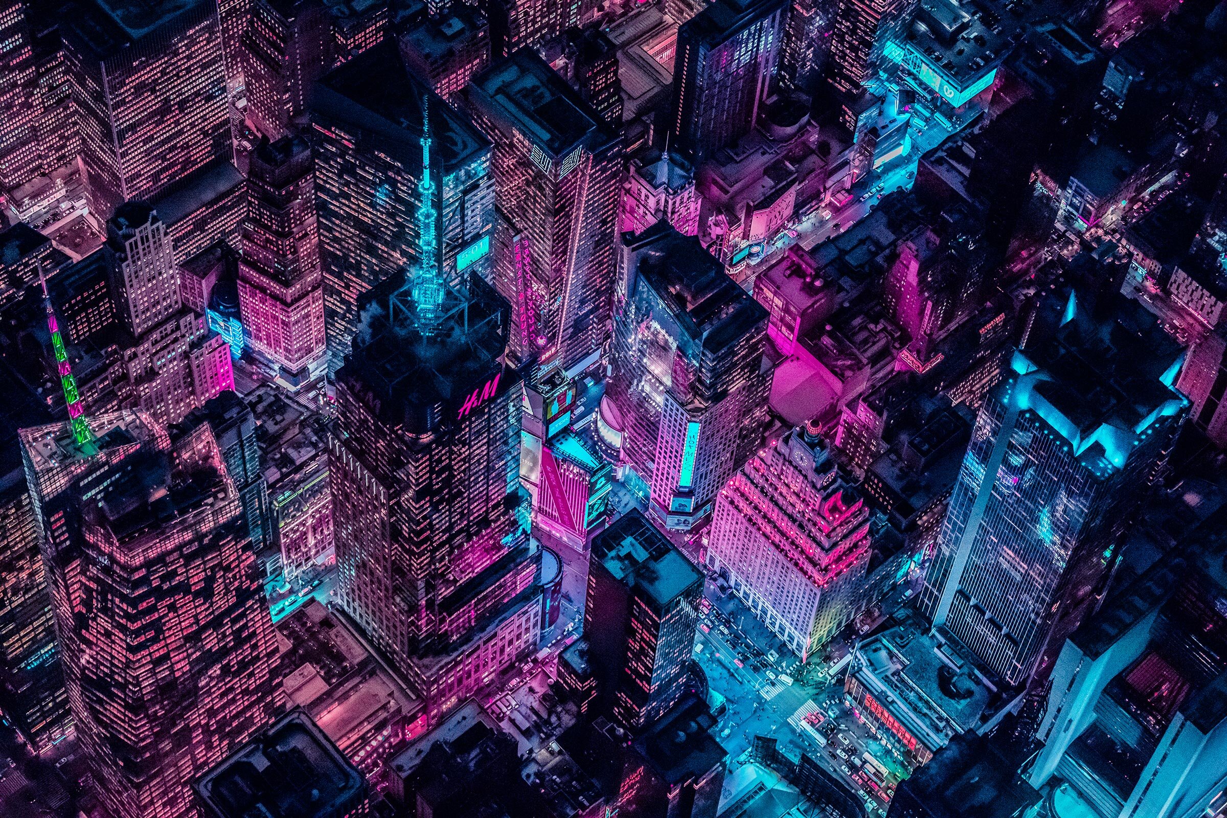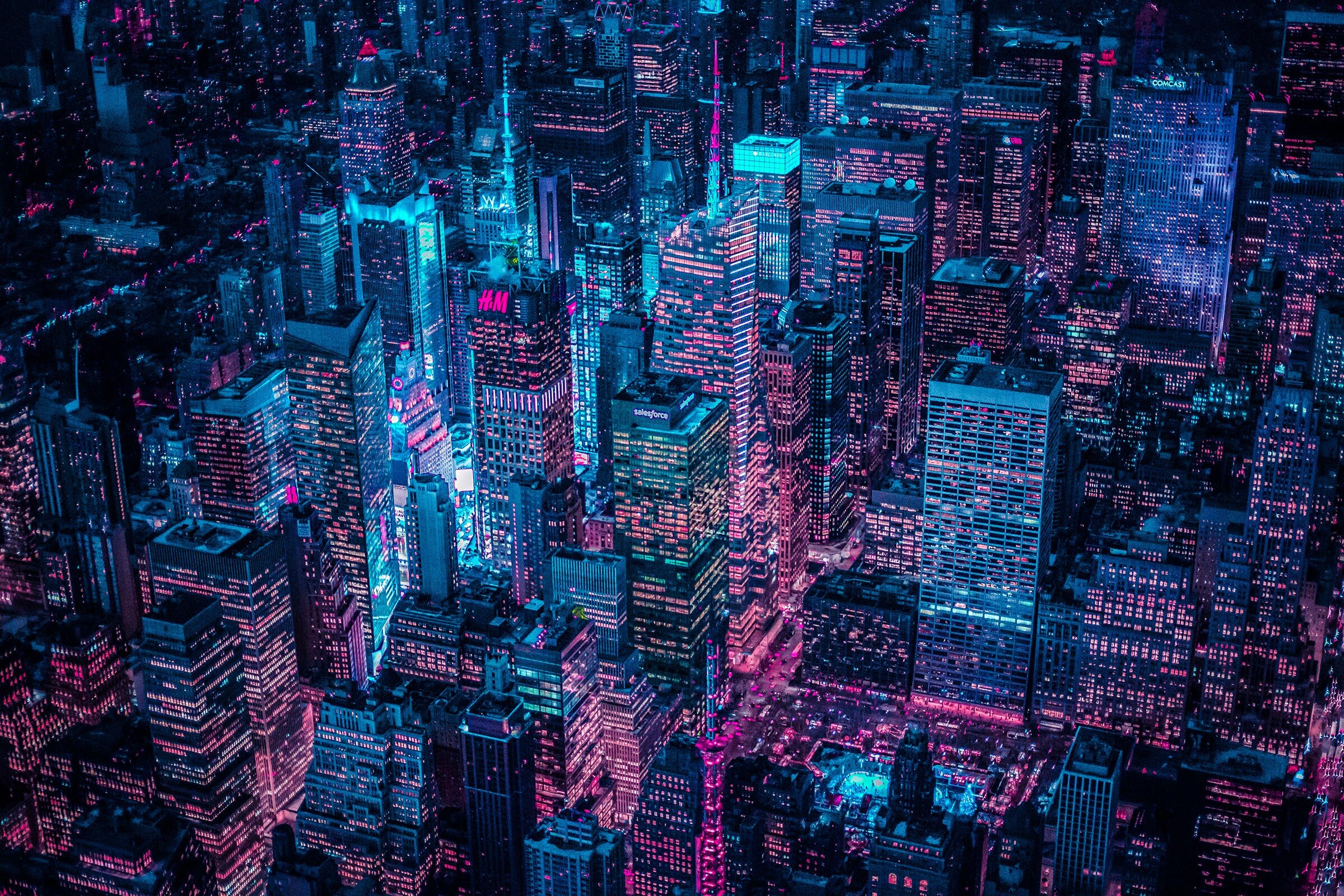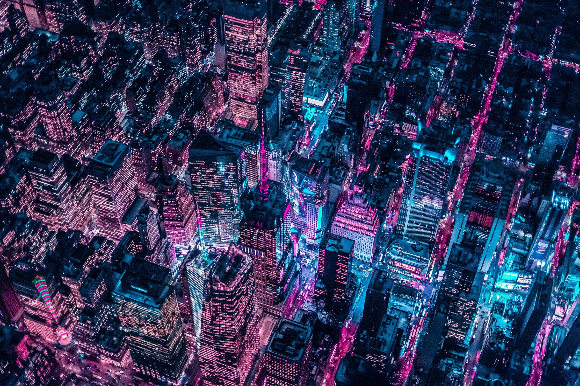 “It’s hard to choose a favorite from all the cities bathed in Xavier’s neon glow, but I have to say his aerial shots of New York City stand out particularly so far.