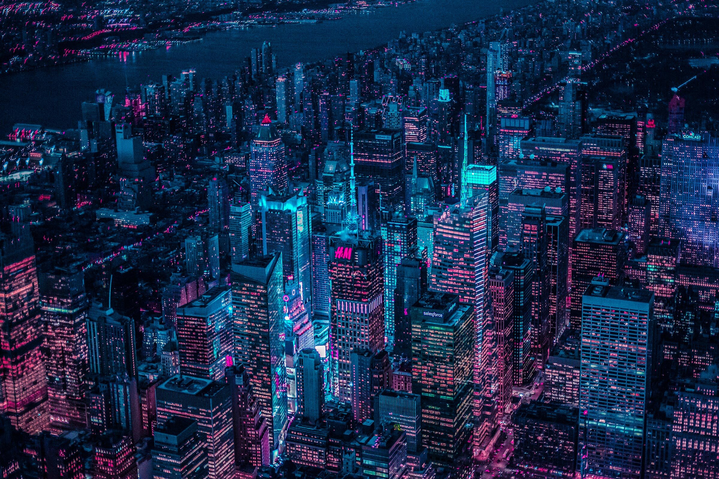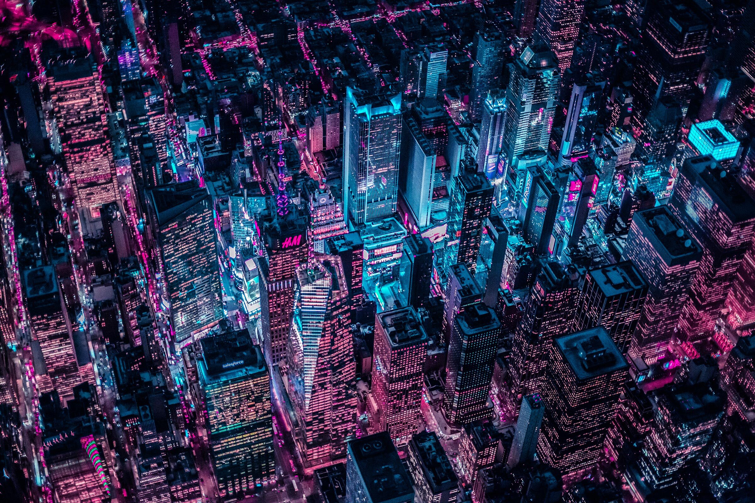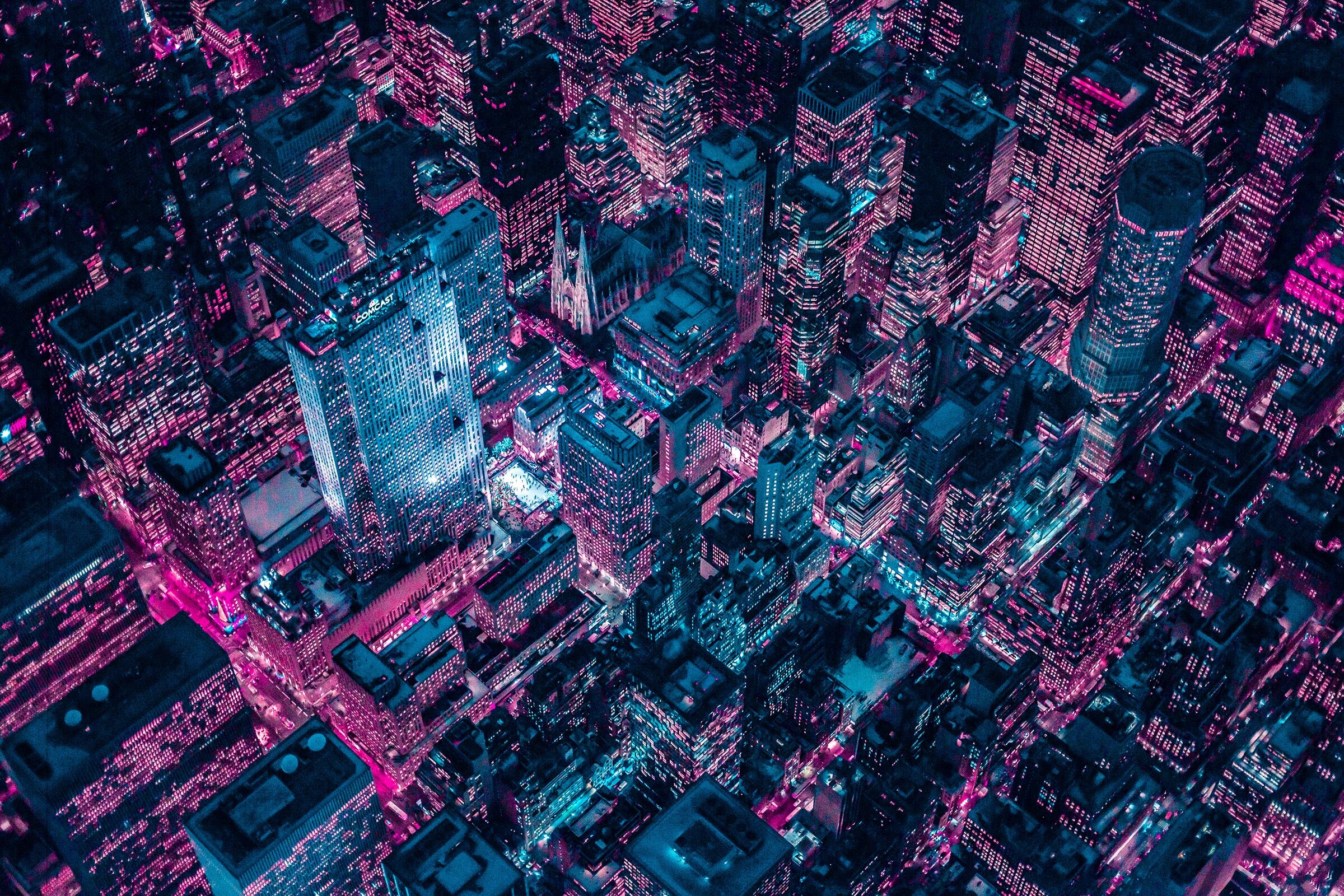 “It’s hard to choose a favorite from all the cities bathed in Xavier’s neon glow, but I have to say his aerial shots of New York City stand out particularly so far.